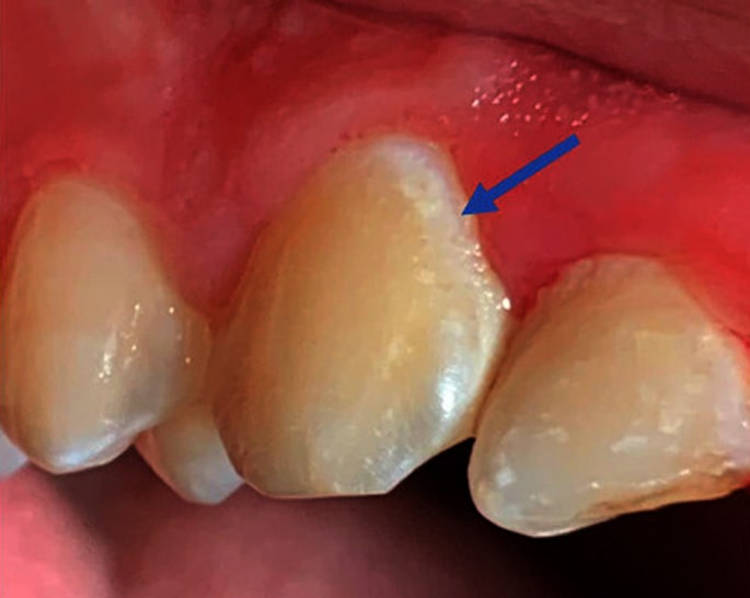 Раннее кариозное поражение проявляется как белое меловидное пятно на эмали. Это участок, где эмаль теряет минералы, но её поверхность остаётся целой, что позволяет лечить поражение без сверления. Белое пятно становится заметнее, когда зуб сухой: воздух в порах изменяет прохождение света и подчёркивает границу поражения. Поэтому стоматолог всегда сушит участок перед осмотром.