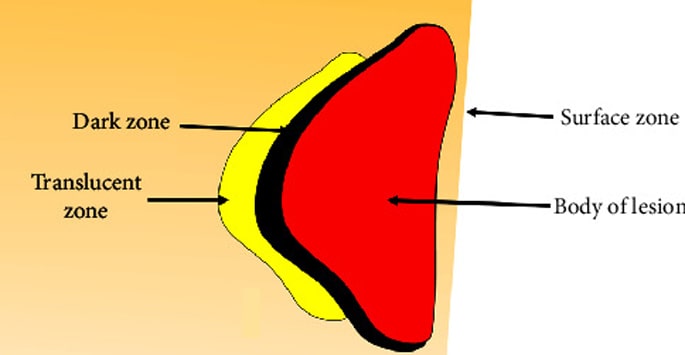 - прозрачная зона — самая внутренняя, встречается не всегда.